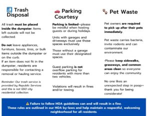 Trash Collection: All trash needs to be placed inside the dumpster in closed trash bags.